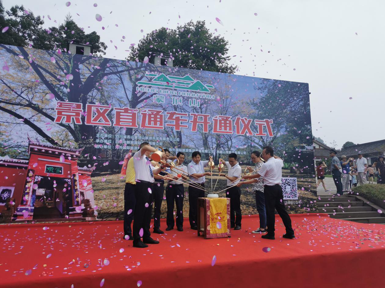 首發(fā)儀式上5輛景區(qū)直通車滿載游客直達(dá)蒙頂山,蒙頂山旅游公司總經(jīng)理衛(wèi)建勇、四川中新旅國際旅游有限公司董事長馮偉、雅安市名山區(qū)文化體育和旅游局局長侯海鷹為此次直通車開通儀式致辭。雅安市人民政府副市長朱濤宣布蒙頂山旅游直通車正式開通,并與市文體旅局局長楊建光、市林業(yè)局局長楊茂雄、文旅集團(tuán)公司總經(jīng)理朱波、名山區(qū)文體旅局局長侯海鷹等人共舉長嘴壺?fù)綕M杯塔,見證蒙頂山景區(qū)旅游直通車正式開通。