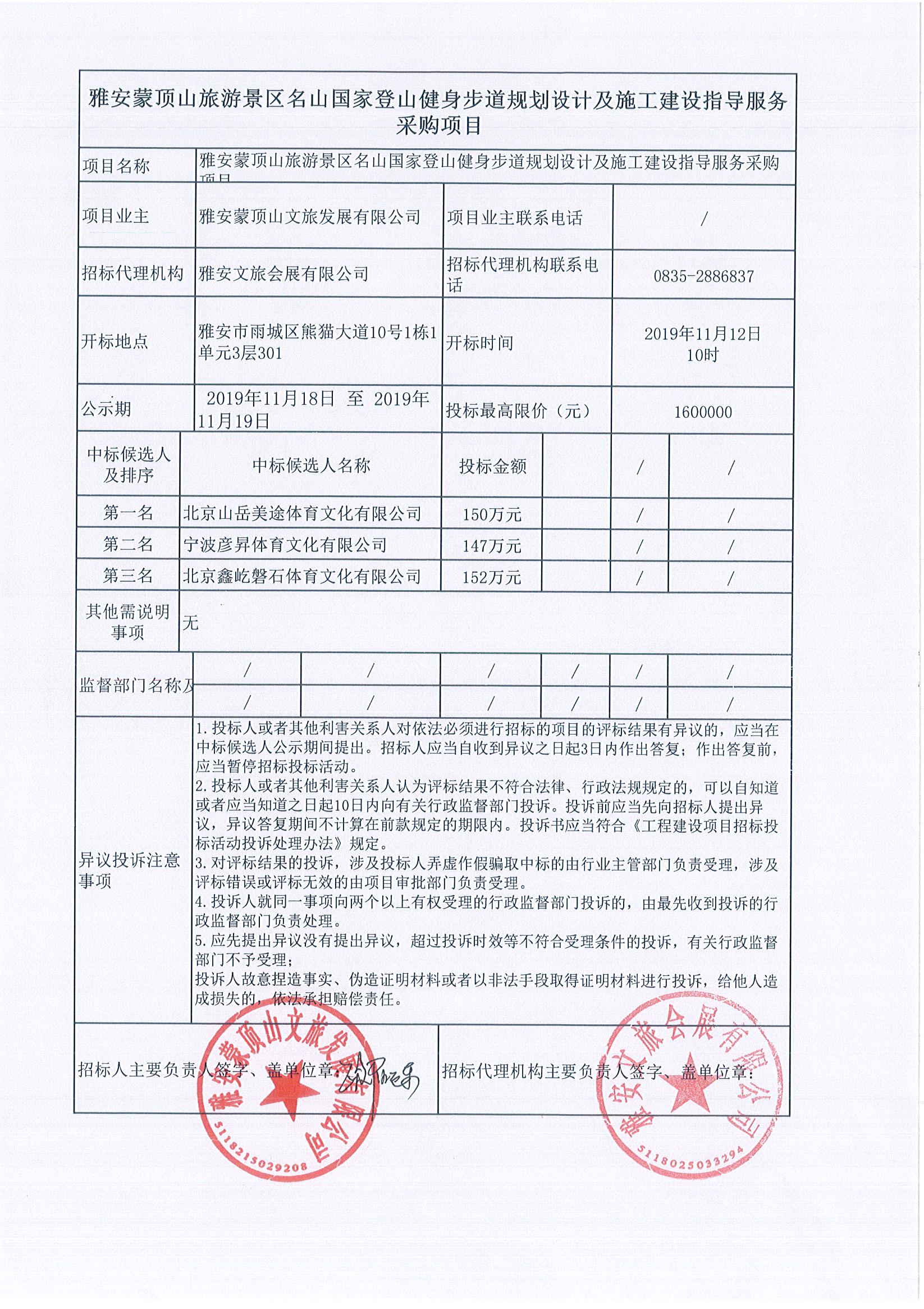 雅安蒙頂山旅游景區(qū)名山國家登山健身步道規(guī)劃設計及施工建設指導服務采購項目結果公示