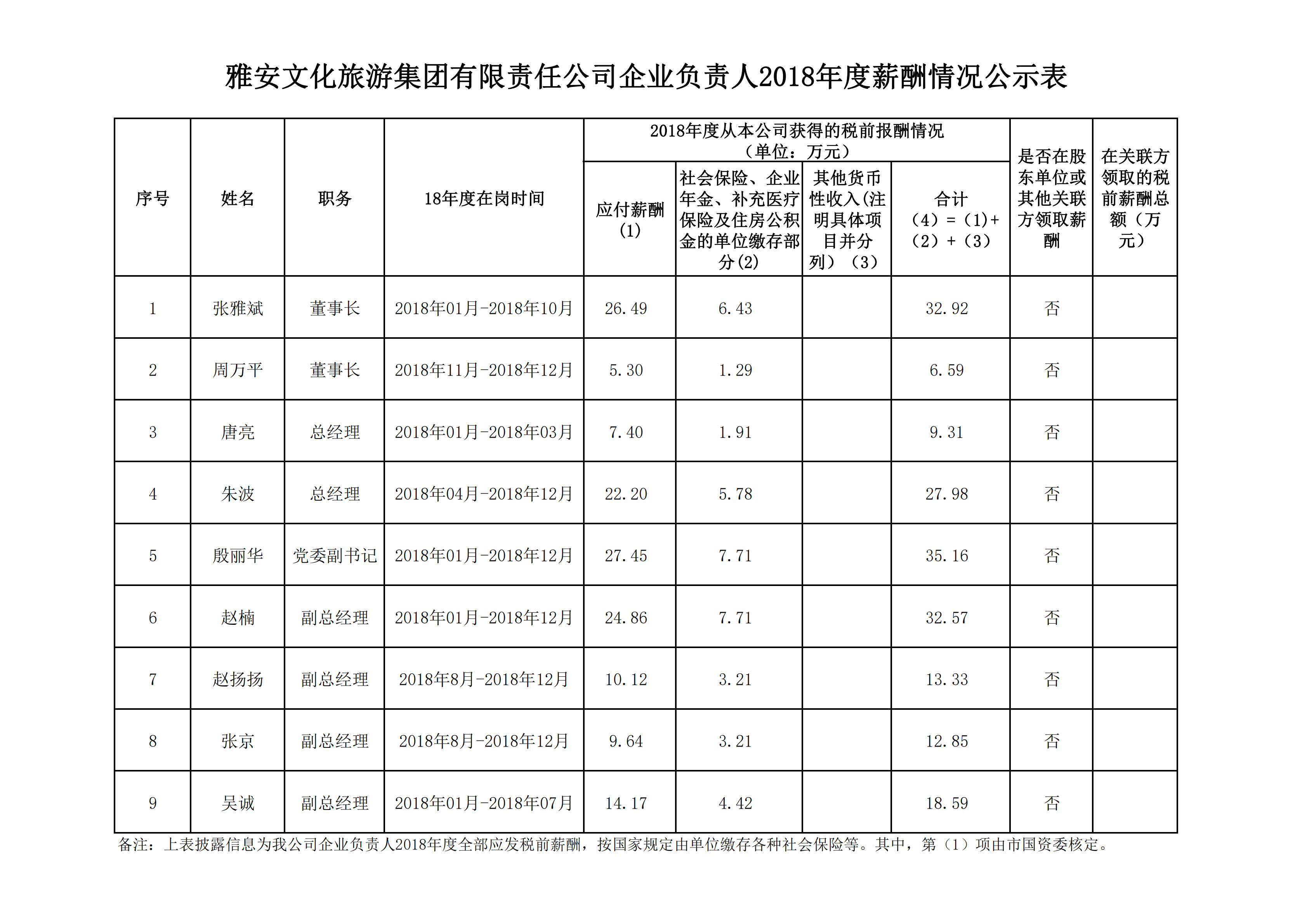雅安文化旅游集團(tuán)有限責(zé)任公司企業(yè)負(fù)責(zé)人2018年度薪酬情況公示表