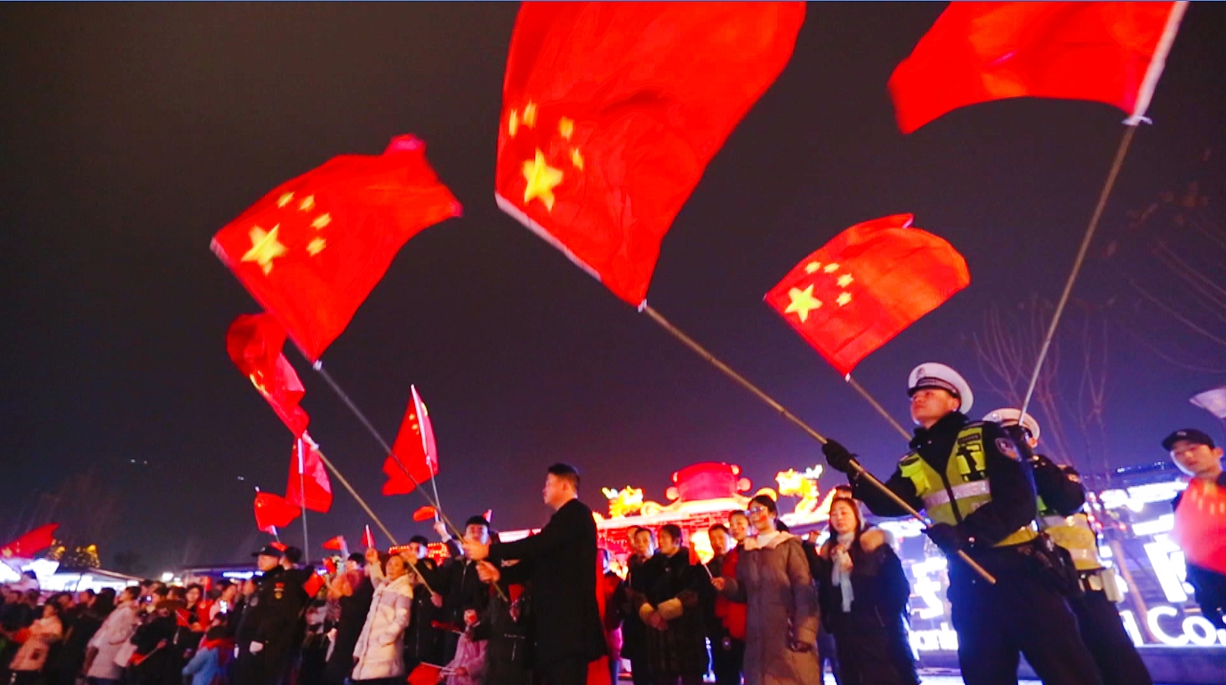 1月31日晚20:00,熊貓燈會華燈璀璨,人流熙熙攘攘?!拔逍羌t旗迎風(fēng)飄揚,勝利歌聲多么嘹亮……”清脆的童聲突然響徹夜空,讓所有人停下了腳步。音樂漸漸響起,人群中響起了唱合的聲音。越來越多的人走了出來,他們身上佩戴著紅色的圍巾,臉上畫著五星紅旗,手中拿著五星紅旗,一邊歌唱,一邊走向燈會的中心廣場。一百多名快閃表演者在中心廣場最具中國傳統(tǒng)特色的“盛世宮燈”前匯聚成矩陣,二十多只大熊貓胖墩兒也手持五星紅旗加入其中?!拔覑勰阒袊?,心愛的母親,我為你流淚,也為你自豪……”載歌載舞的快閃表演,很快把園內(nèi)的觀燈群眾吸引了過來,隨著歌曲的高潮,全場五星紅旗都揮舞起來,人們高舉雙手,打著拍子,一起唱和,激情澎湃。