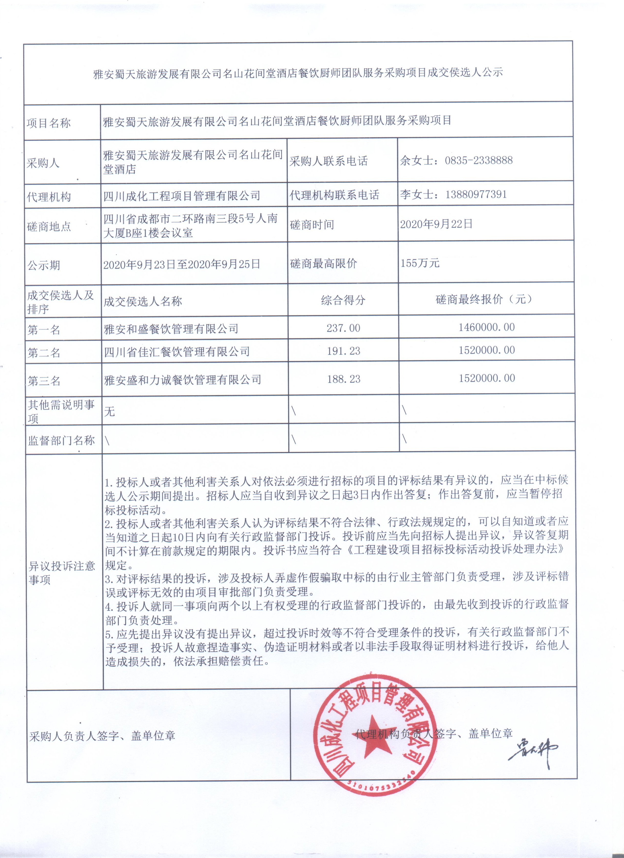 雅安蜀天旅游發(fā)展有限公司名山花間堂酒店餐飲廚師團(tuán)隊服務(wù)采購項目成交候選人公示