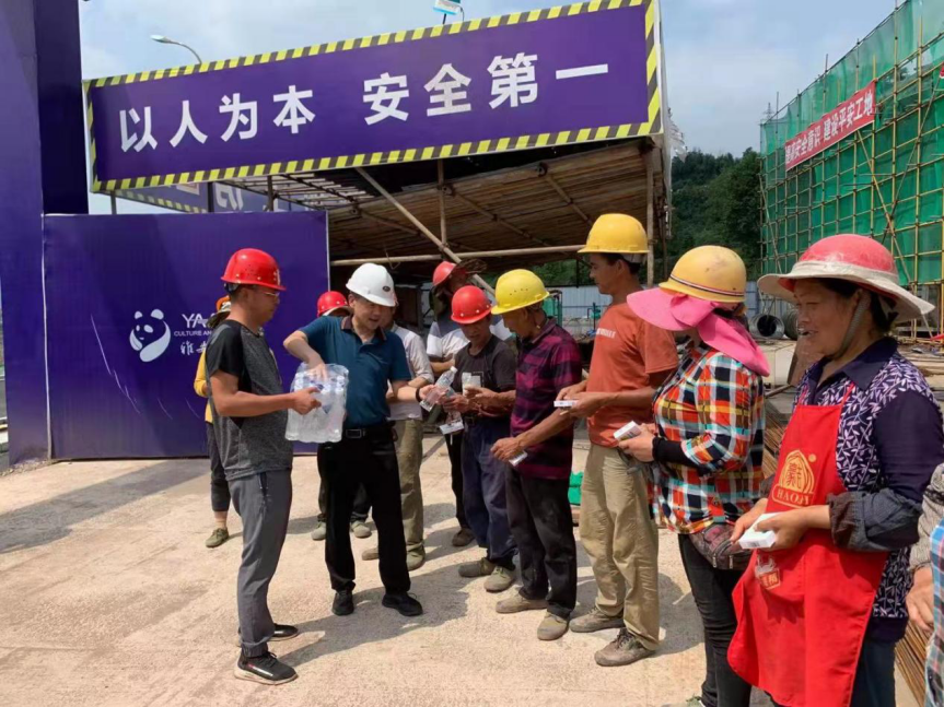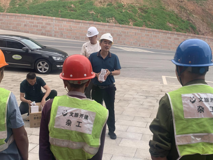 在熊貓高地和皇茶項目,王躍分別向戶外高溫作業(yè)下的現(xiàn)場施工人員及管理人員派發(fā)藿香正氣液、礦泉水等防暑降溫物資,把清涼送到了生產(chǎn)一線,把關(guān)懷送到了員工心坎。他首先感謝大家克服高溫炎熱、盡職盡責的工作,并叮囑大家在保證安全生產(chǎn)的同時,一定要注意做好防暑降溫工作,避免中暑,將自己身體健康放在首位,為公司發(fā)展再建新功。