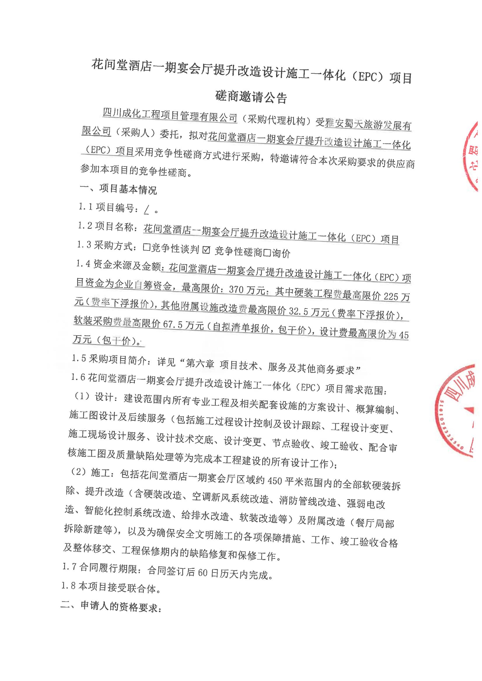 花間堂酒店一期宴會廳提升改造設(shè)計(jì)施工一體化(EPC)項(xiàng)目磋商邀請公告(1)