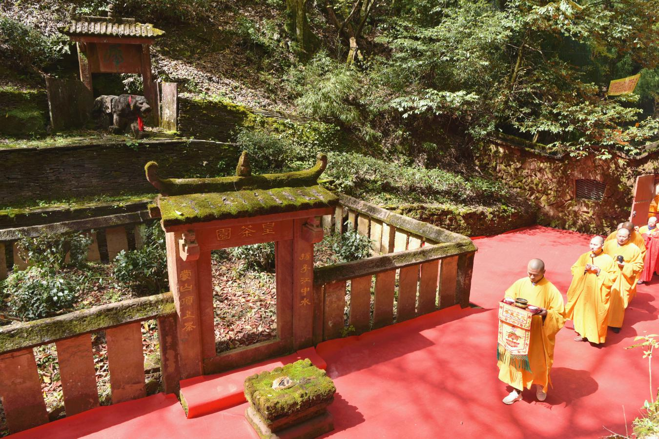 開園儀式上,在蒙頂五峰之心——皇茶園,由眾僧人灑凈、焚香、禮拜,然后入園采茶,再現(xiàn)了蒙頂山茶作為皇室貢品敬天祭祖的文化傳承和歷史輝煌。