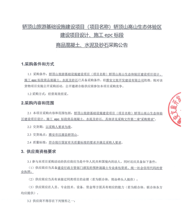 轎頂山旅游基礎(chǔ)設(shè)施建設(shè)項(xiàng)目 (項(xiàng)目名稱)轎頂山高山生態(tài)體驗(yàn)區(qū)建設(shè)項(xiàng)目設(shè)計(jì)、施工epc標(biāo)段商品混凝土、水泥及砂石采購公告