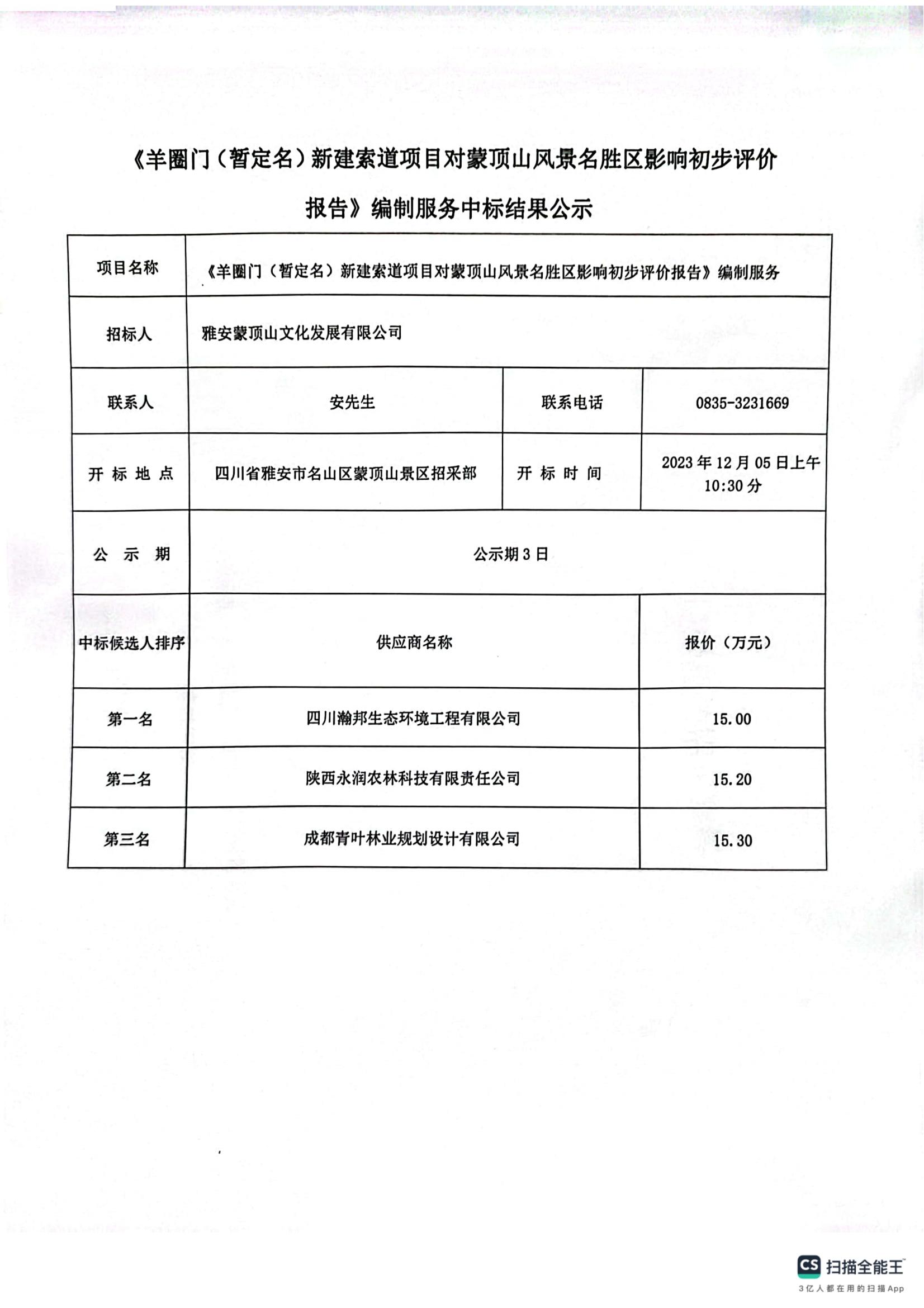 《羊圈門(暫定名)新建索道項(xiàng)目對蒙頂山風(fēng)名勝區(qū)影響初步評價(jià)報(bào)告》編制服務(wù)中標(biāo)結(jié)果公示