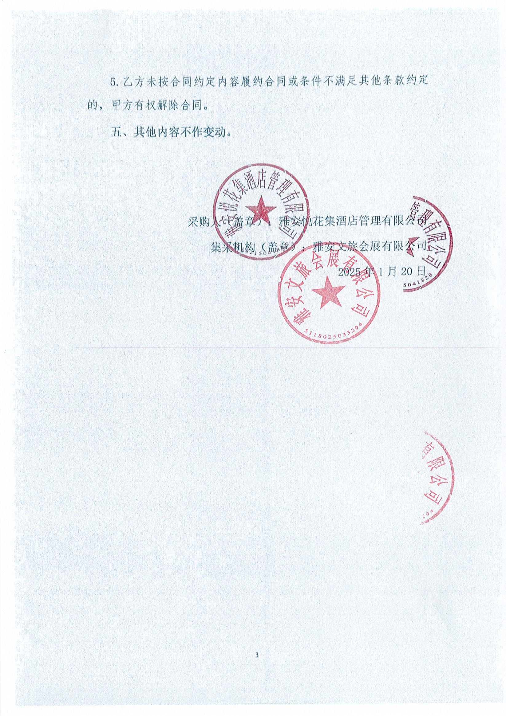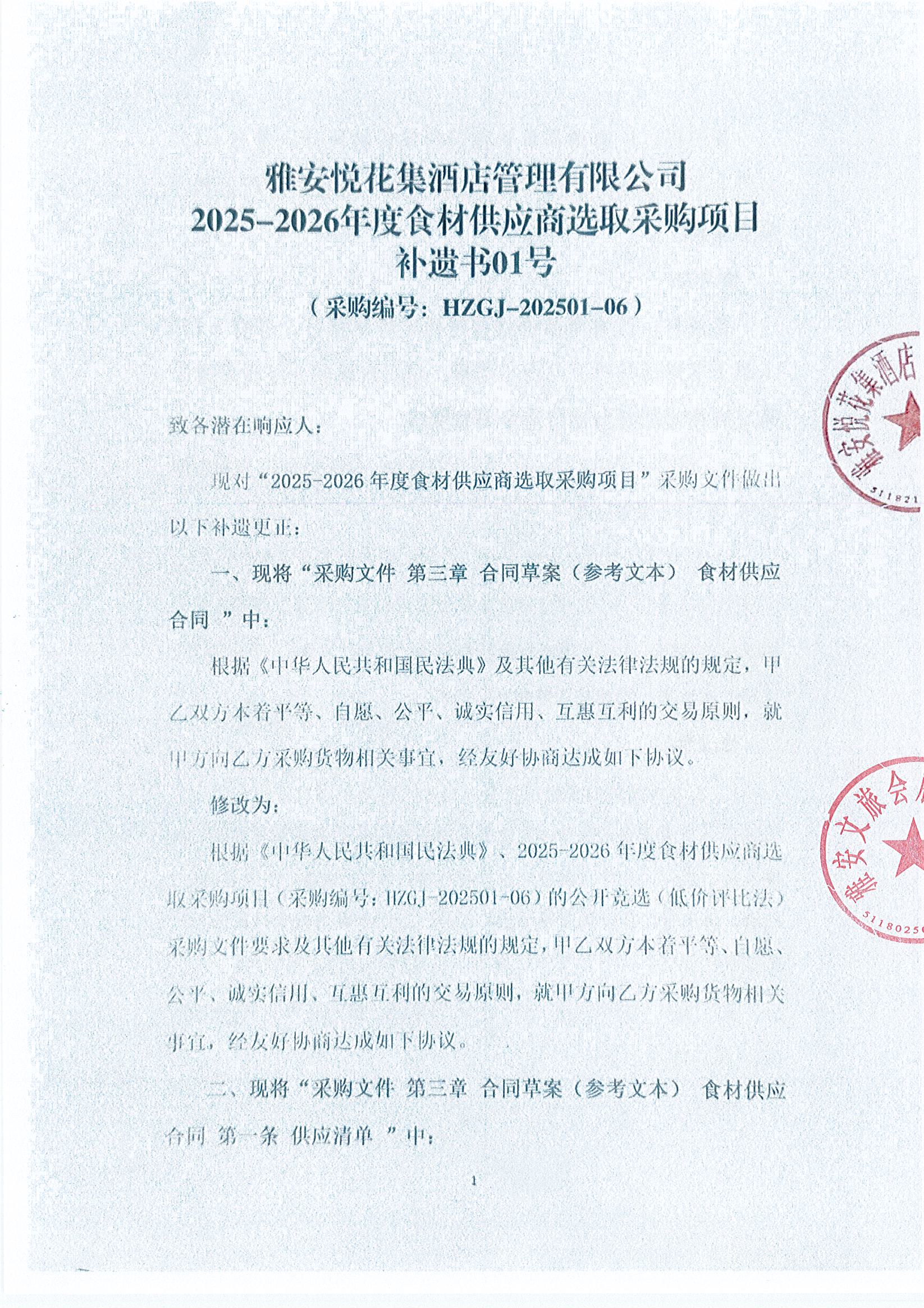 雅安悅花集酒店管理有限公司 2025- 2026年度?材供應(yīng)商選取采購項(xiàng)目 補(bǔ)遺 書01號(hào)